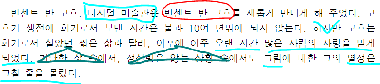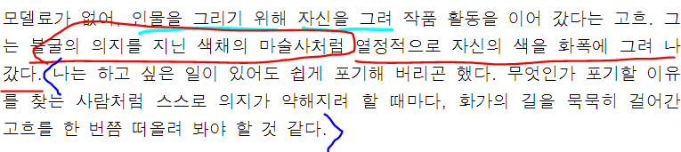 두 번째 문제는 '비유적 방식을 활용하여 고흐가 어떤 화가였는지를 표현해야겠어'입니다. 이 부분은 제가 마지막 부분에서 빨간색으로 동그라미와 밑줄을 쳐두었습니다. 이 문장이 답인데요, '그는'부터 '나갔다'까지 적으면 될 것 같습니다.