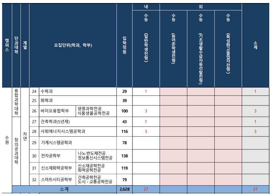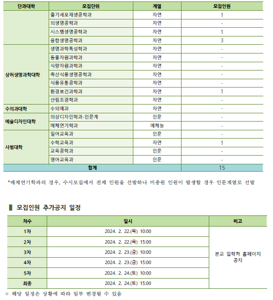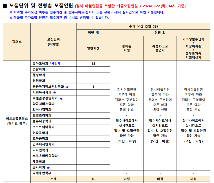 | [2024학년도 정시 추가모집 1차] 가톨릭꽃동네대학교, 경일대학교, 광주여자대학교, 남부대학교, 서울장신대학교, 예원예술대학교, 중부대학교, 한경국립대학교 (0) |