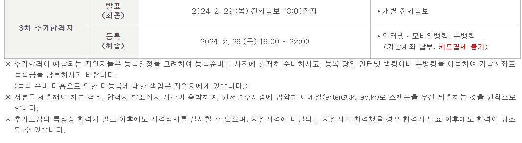 | [2024학년도 정시 추가모집 1차] 경성대학교, 경운대학교, 계명대학교, 고려대학교(세종), 고신대학교, 광신대학교, 광주대학교, 국립강릉원주대학교 (0) |