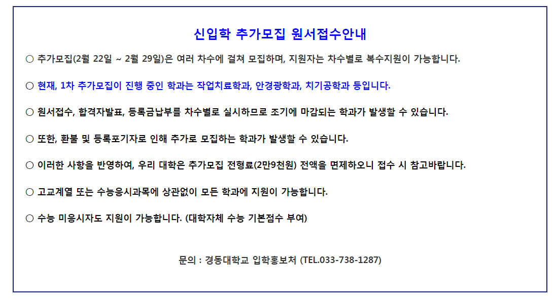 정시 충원이 마무리되고 추가모집이 시작되었습니다. 오늘은 건국대학교 서울캠퍼스, 건국대학교(글로컬), 건양대학교, 경기대학교, 경남대학교, 경동대학교, 경북대학교, 경상국립대학교의 추가모집 요강에 대해 함께 살펴보도록 하겠습니다.