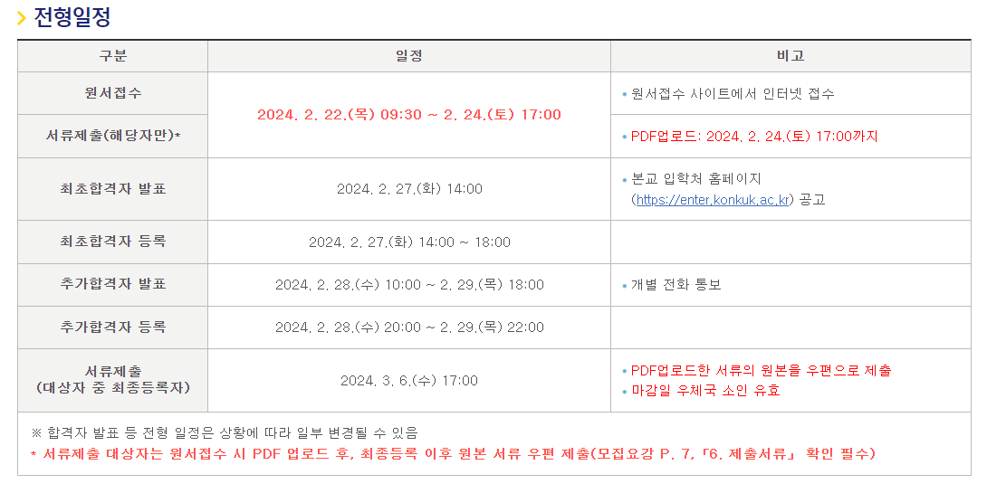건국대학교의 원서접수는 2월 22일 목요일 오전 9시 30분부터 2월 24일 토요일 오후 5시까지입니다.