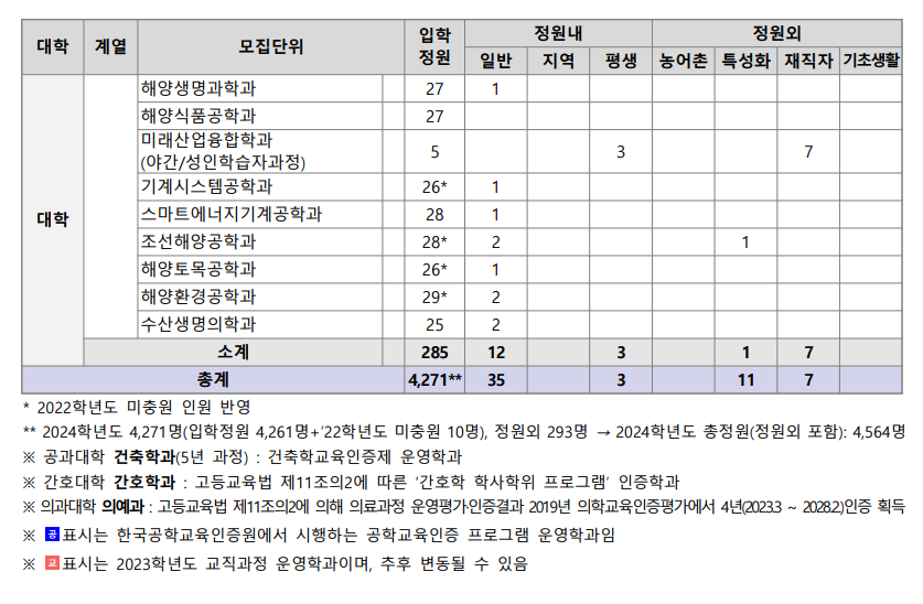 | [2024학년도 정시 추가모집 1차] 국립공주대학교, 국립군산대학교, 국립금오공과대학교, 국립목포대학교, 국립목포해양대학교, 국립부경대학교, 국립순천대학교, 국립안동대학교 (0) |