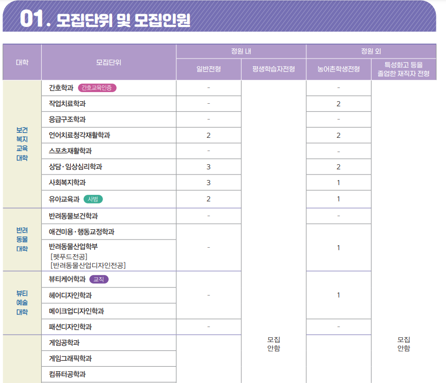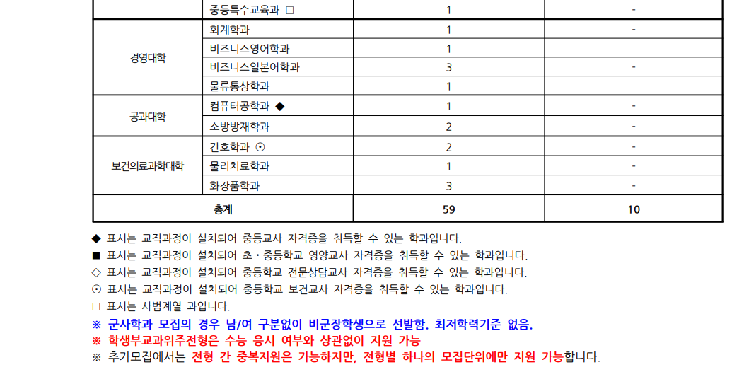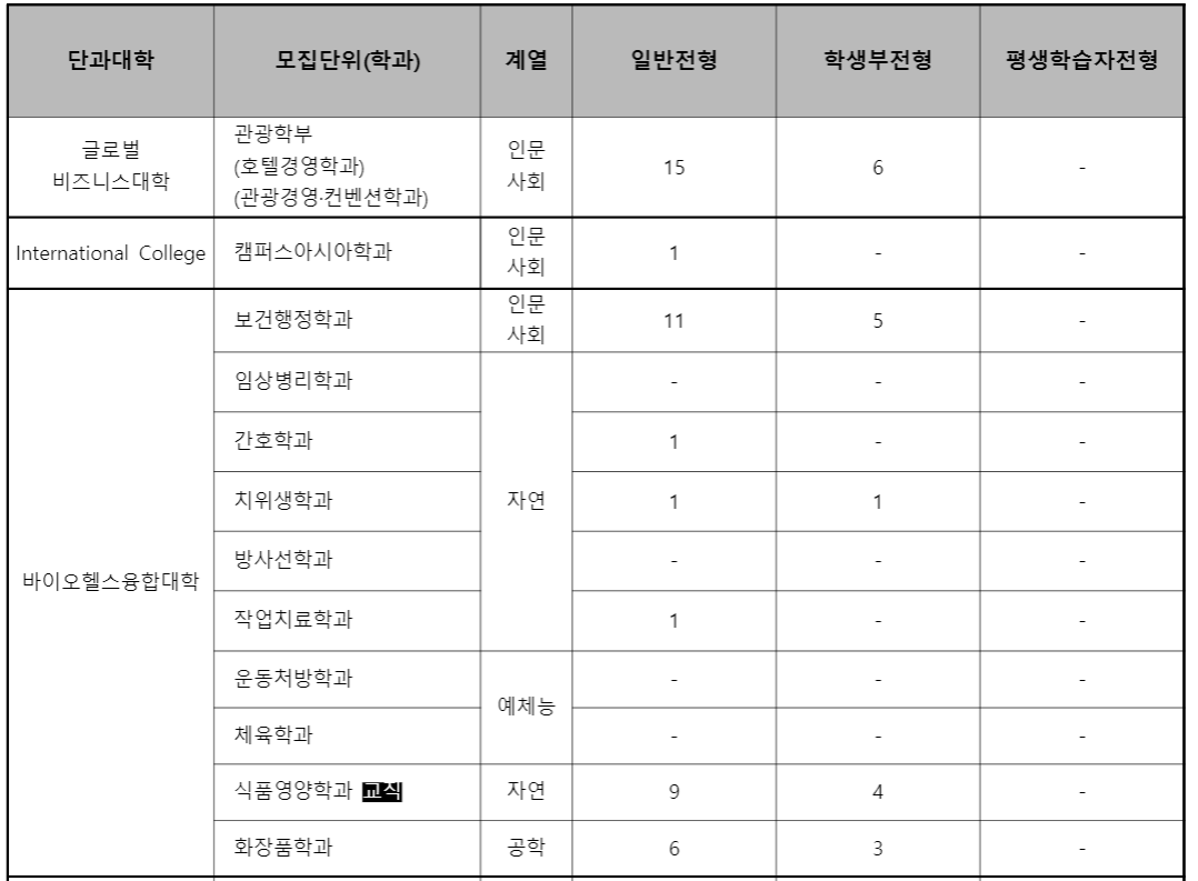 모집 학과와 인원은 다음과 같습니다. 모집 인원이 적은 편이니 신중히 지원하시기 바랍니다.