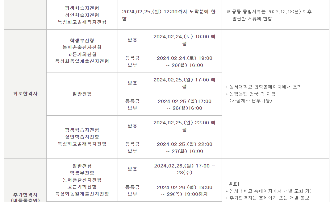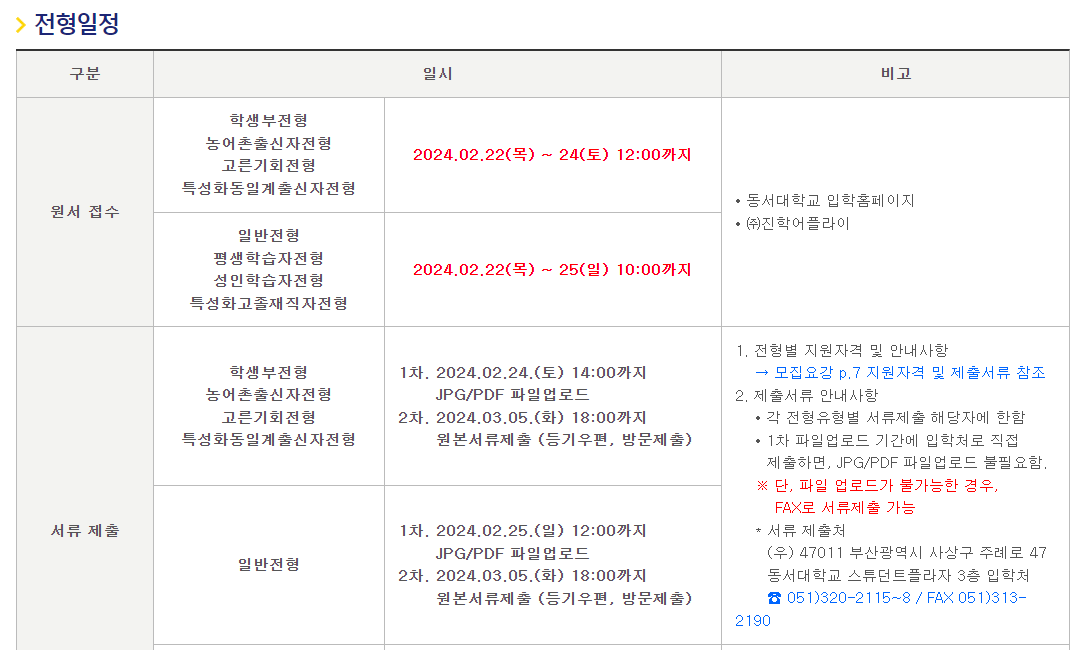 동서대학교의 원서접수는 2월 22일부터 시작이며, 전형에 따라 마감일이 다릅니다. 학생부전형, 농어촌출신자전형, 고른기회전형, 특성화동일계출신자전형은 마감일이 24일 토요일 12시까지이며, 일반전형, 평생학습자전형, 성인학습자전형, 특성화고졸재직자전형의 마감일은 25일 일요일 오전 10시까지입니다.