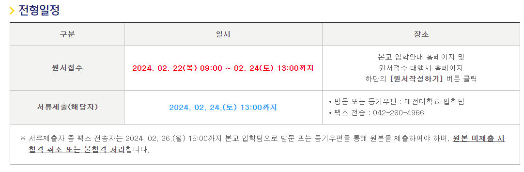 대전대학교의 원서접수 기간은 2월 22일 목요일 오전 9시부터 2월 24일 토요일 오후 1시까지입니다. 합격자 발표는 2월 24일 토요일 오후 8시입니다.