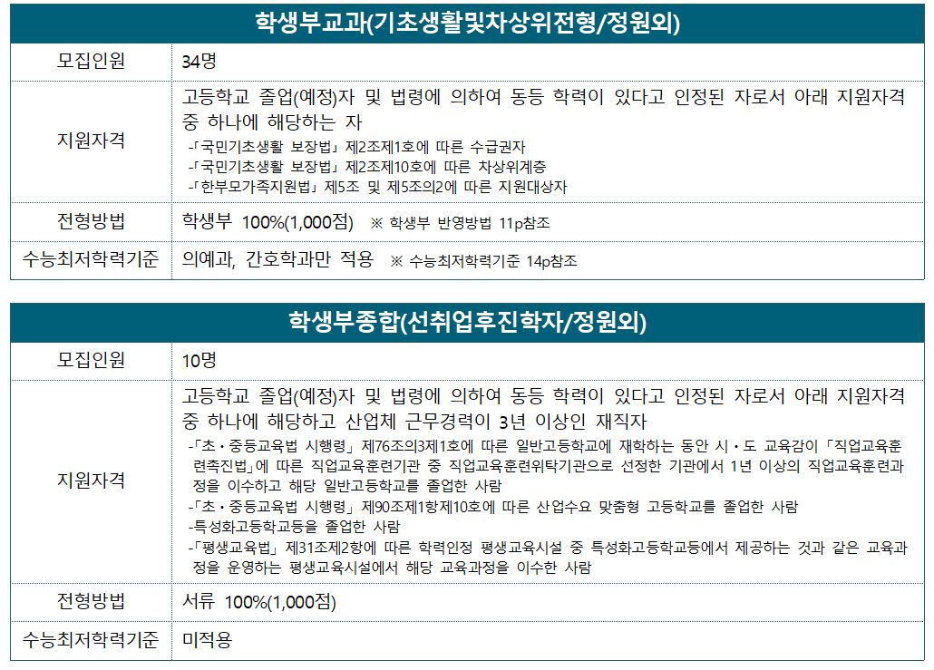 의예과, 간호학과 수시모집에는 최저기준이 있는데, 의예과의 경우 국수영탐 중 3합 4, 일반전형을 제외하고는 국수영탐 중 3합 5, 간호학과는 모든 전형 국수영탐 중 3합 13입니다.
