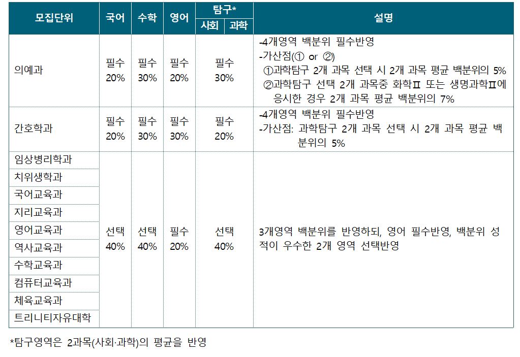 나머지 학과는 국어, 수학, 탐구는 선택하여 40%를, 영어는 필수로 20%를 반영하는데, 이 때 3개 영역 백분위를 반영하되 영어를 필수로 반영하고, 백분위 성적이 우수한 2개 영역을 선택하여 반영합니다. 즉, 국/수/탐 중 우수한 영역 두 개만 보는 것입니다.