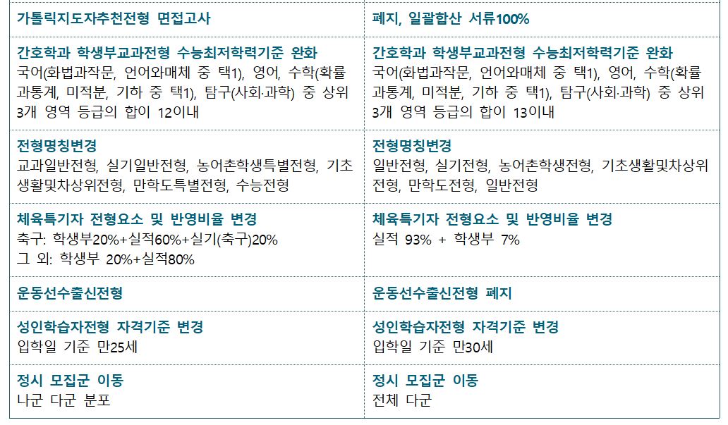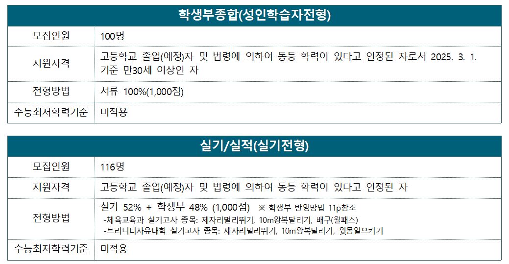 운동선수출신전형은 폐지되었으며, 성인학습자전형 자격기준이 상향되었습니다. 기존에는 입학일 기준 만25세였지만, 올해부터는 입학일 기준 만30세부터입니다.