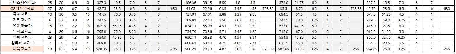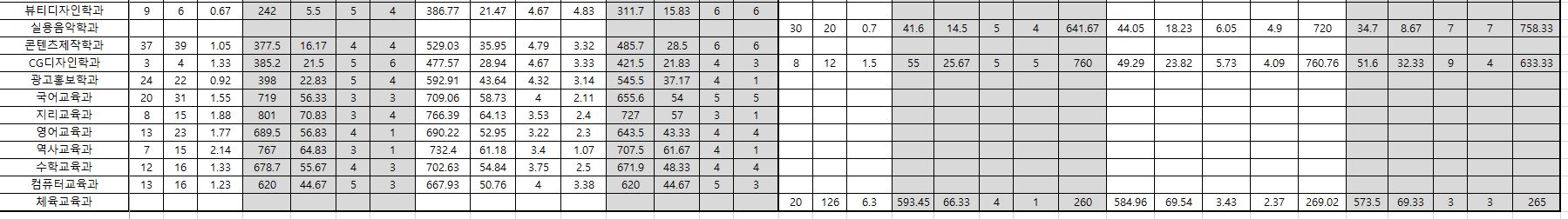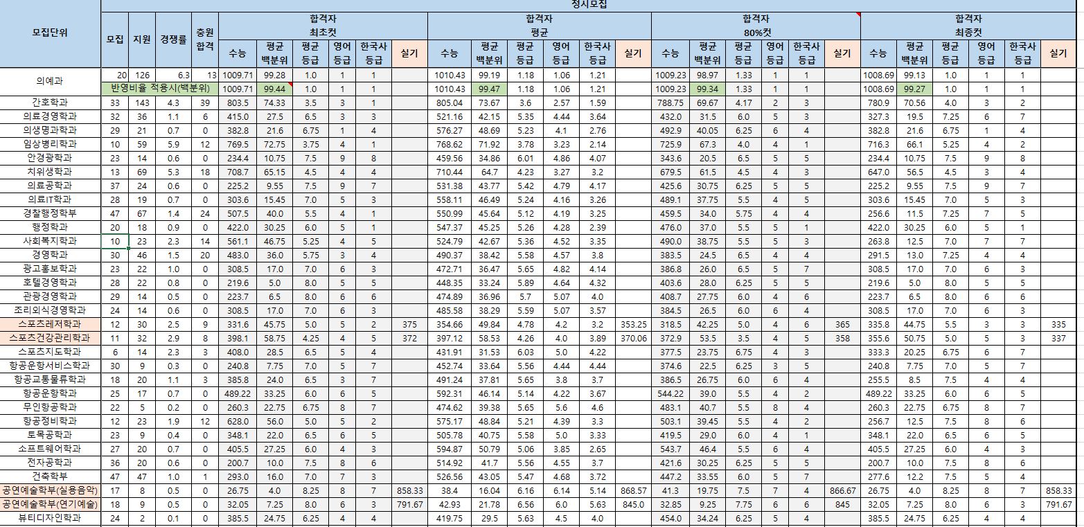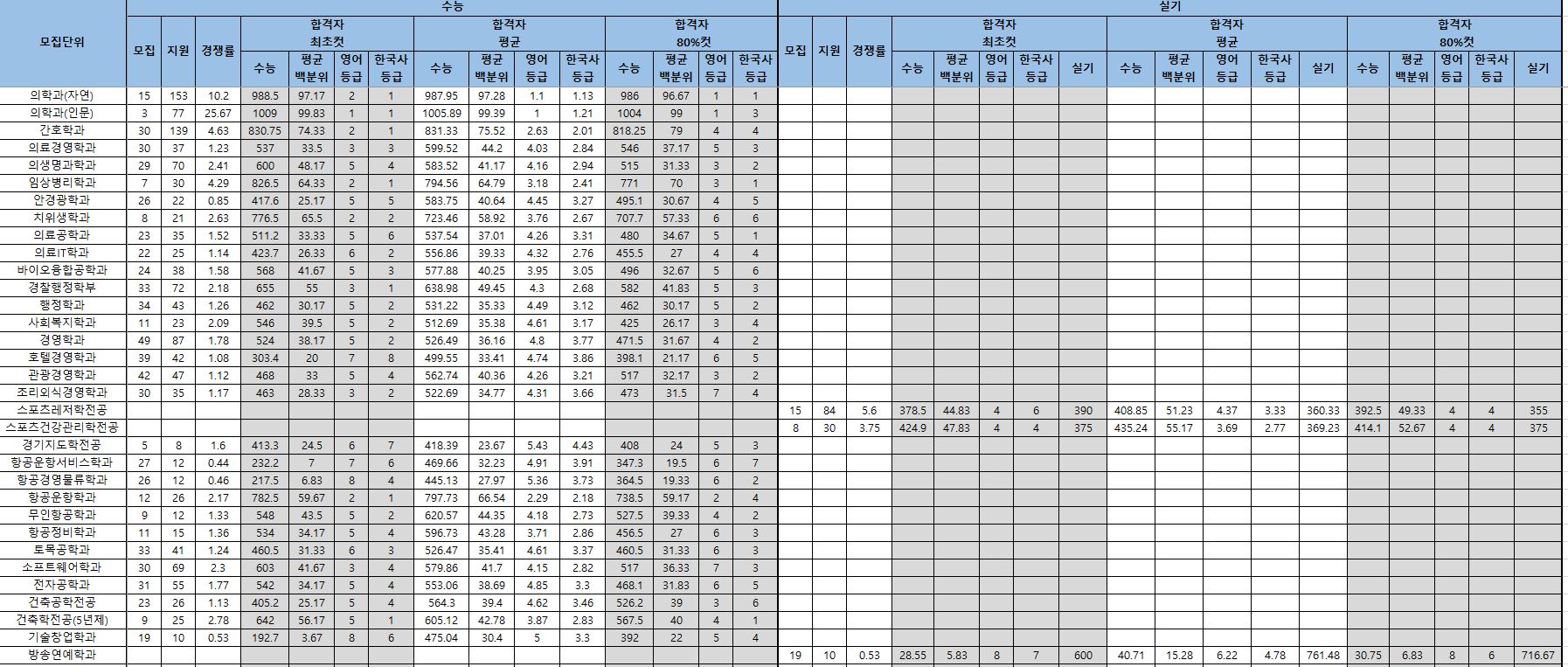 이외 학과들을 경쟁률, 성적(백분위, 최초컷) 순으로 보자면 의예과(6.3, 99.44), 간호학과(4.3, 74.33), 의료경영학과(1.1, 27.5), 치위생학과(5.3, 65.15), 경찰행정학부(1.4, 40), 사회복지학과(2.3, 46.75), 경영학과(1.5, 36), 스포츠레저학과(2.5, 45.75), 스포츠건강관리학과(2.9, 58.75), 스포츠지도학과(2.3, 28.5), 항공교통물류학과(1.1, 24), 항공정비학과(1.9, 56), 건축학부(1, 16), 국어교육과(3.6, 70), 지리교육과(3.8, 70), 영어교육과(2.2, 55.25), 역사교육과(3.6, 75), 수학교육과(1.3, 45.85), 컴퓨터교육과(1, 40.5), 체육교육과(5.4, 76)이었습니다.