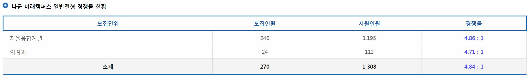 나군 미래캠퍼스 일반전형에서는 자율융합계열, 의예과의 신입생을 모집했으며, 자율융합계열의 경쟁률은 4.86:1, 의예과의 경쟁률은 4.71:1 이었습니다.