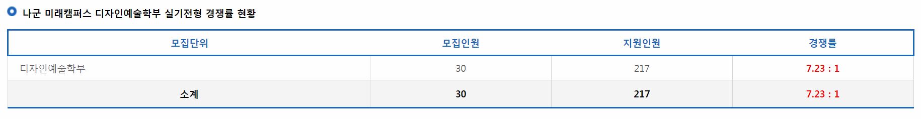 나군 미래캠퍼스 디자인예술학부 실기전형에서는 디자인예술학부의 신입생을 모집했으며, 경쟁률은 7.23:1 이었습니다.