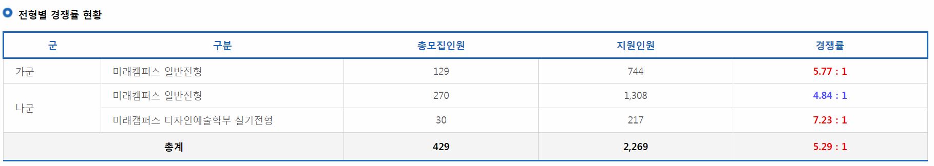 전형별 경쟁률 현황을 살펴보자면, 가군 미래캠퍼스 일반전형의 경쟁률은 5.77:1, 나군 미래캠퍼스 일반전형의 경쟁률은 4.84:1, 미래캠퍼스 디자인예술학부 실기전형의 경쟁률은 7.23:1 이었습니다.