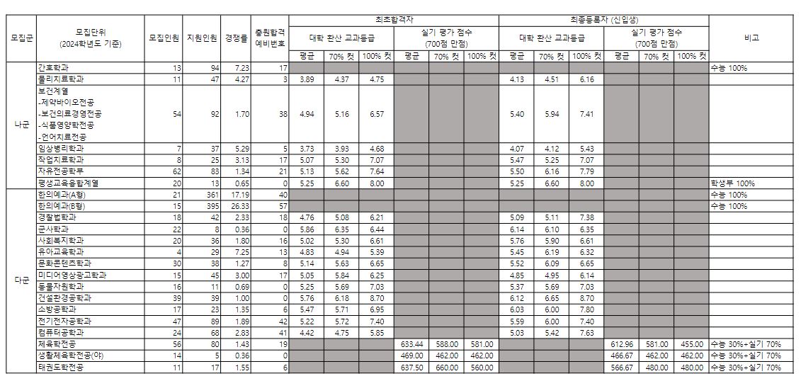 나군 : 간호학과, 물리치료학과, 보건계열(제약바이오전공, 보건의료경영전공, 식품영양학전공, 언어치료전공), 임상병리학과, 작업치료학과, 자유전공학부, 평생교육융합계열