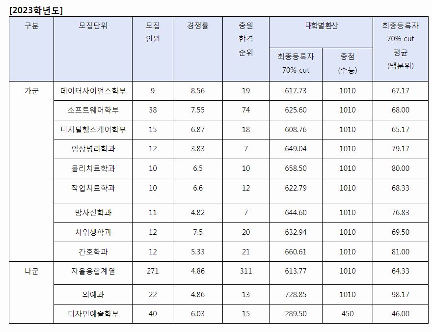 원래 3개년 정시 등급을 포스팅하지만, 연세대학교 미래캠퍼스는 작년 정시 등급만을 공개하고 있기에 2023학년도의 자료만을 포스팅하도록 하겠습니다.