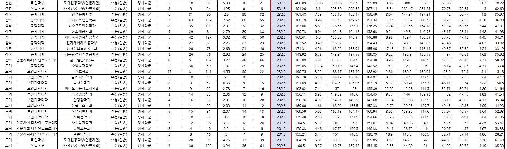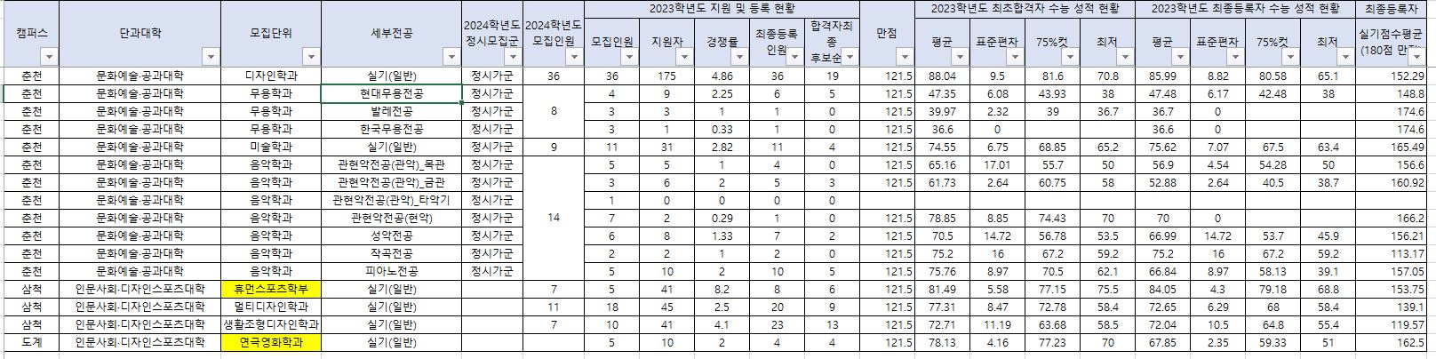 춘천캠퍼스의 무용학과 한국무용전공, 음악학과 관현악전공(관악)_타악기, 음악학과 관현악전공(현악)은 미달이었기 때문에 빼고 다른 학과들의 경쟁률, 최종등록자 수능 성적 75%컷을 적어보자면