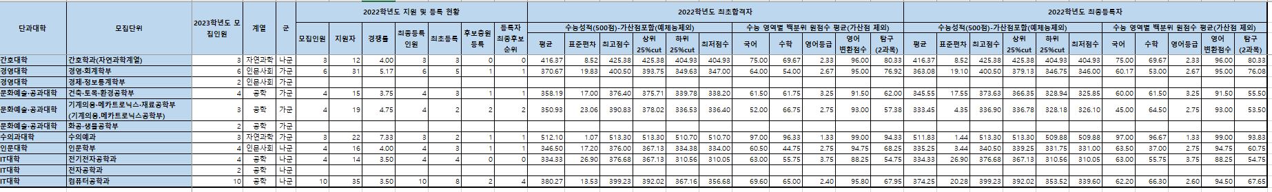 간호학과(인문계열)(4.33, 429), 간호학과(자연계열)(3.6, 426.7), 경영회계학부(4.6, 389.5), 경제정보통계학부(5.91, 383), 관광경영학과(4.71, 382.63), 국제무역학과(5.33, 382.5), 바이오산업공학부(4.81, 376.26), 생물자원과학부(6.8, 371.19), 원예농업자원경제학부(6.43, 368.48), 지역건설공학과(6.75, 362.74), 환경융합학부(5.33, 374.63), 동물산업융합학과(6.43, 367.51), 동물응용과학과(6.13, 371.98) , 동물자원과학과(6, 364.68), 건축학과(5년제)(7, 409.23), 건축토목환경공학부(5.32, 379.29), 기계의용메카트로닉스공학과(4.48, 386.93), 배터리융합공학과(5.44, 393.6), 에너지자원산업공학부(5, 382.7), 화공생명공학부(4.86, 390.33), 스포츠과학과(4.13, 127.95), 영상문화학과(4.79, 387), 교육학과(4.2, 386), 국어교육과(4.45, 405.5), 역사교육과(4.67, 398.5), 영어교육과(4.17, 405.75), 윤리교육과(5.6, 394.5), 일반사회교육과(4, 405.25), 지리교육과(4, 366.5), 한문교육과(5.33, 390.63), 가정교육과(5.5, 379.97), 과학교육학부(3.07, 400.81), 수학교육과(3.82, 402.71), 체육교육과(2.92, 218.5), 문화인류학과(6.43, 377.25), 미디어커뮤니케이션학과(6, 378.38), 부동산학과(5.33, 381.5), 사회학과(7.75, 384.5), 정치외교학과(6.5, 385.25), 행정심리학부(5.11, 380.13), 목재종이과학부(6.75, 362.67), 산림과학부(5.76, 372.5), 생태조경디자인학과(6.33, 374.91), 수의예과(4.85, 516.95), 의예과(6.53, 524.81), 약학과(5.67, 516.75), 분자생명과학과(8, 372.2), 생명건강공학과(5.4, 390.35), 생물의소재공학과(9.43, 381.14), 의생명융합학부(5.59, 364.73), 인문학부(5.06, 379), 반도체물리학과(5, 371), 생명과학과(8.38, 376.79), 수학과(4.75, 377.29), 지질지구물리학부(7.33, 373.51), 화학생화학부(4.33, 378.6), 전기전자공학과(4, 395.35), 전자공학과(4.08, 398.96), 컴퓨터공학과(4.27, 404.24), AI융합학과(4.54, 398.05), 디지털밀리터리학과(6.29, 378.69), 자유전공학부(인문계열)(5.39, 388), 자유전공학부(자연계열)(4.25, 383.47)