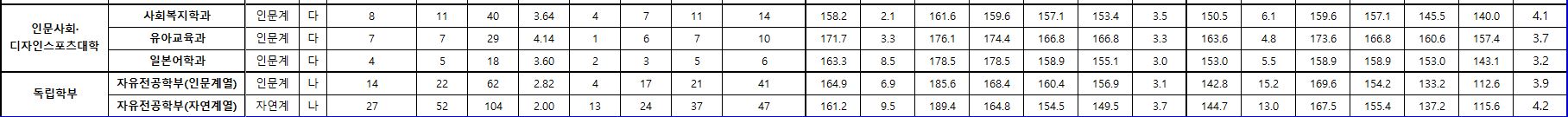 소방방재학부(1.97, 127), 간호학과(4.55, 186.5), 물리치료학과(5.4, 178.45), 방사선학과(6.33, 180.41), 바이오기능성소재학과(2.78, 112.58), 식품영양학과(2.36, 146), 안경광학과(2.31, 131.08), 응급구조학과(2.09, 139.35), 작업치료학과(2.07, 153.85), 치위생학과(3.2, 144.38), 사회복지학과(3.17, 149.38), 유아교육과(2.5, 128.75), 일본어학과(2, 118.5), 자유전공학부(인문계열)(4.75, 148.5), 자유전공학부(자연계열)(3.24, 144.89)