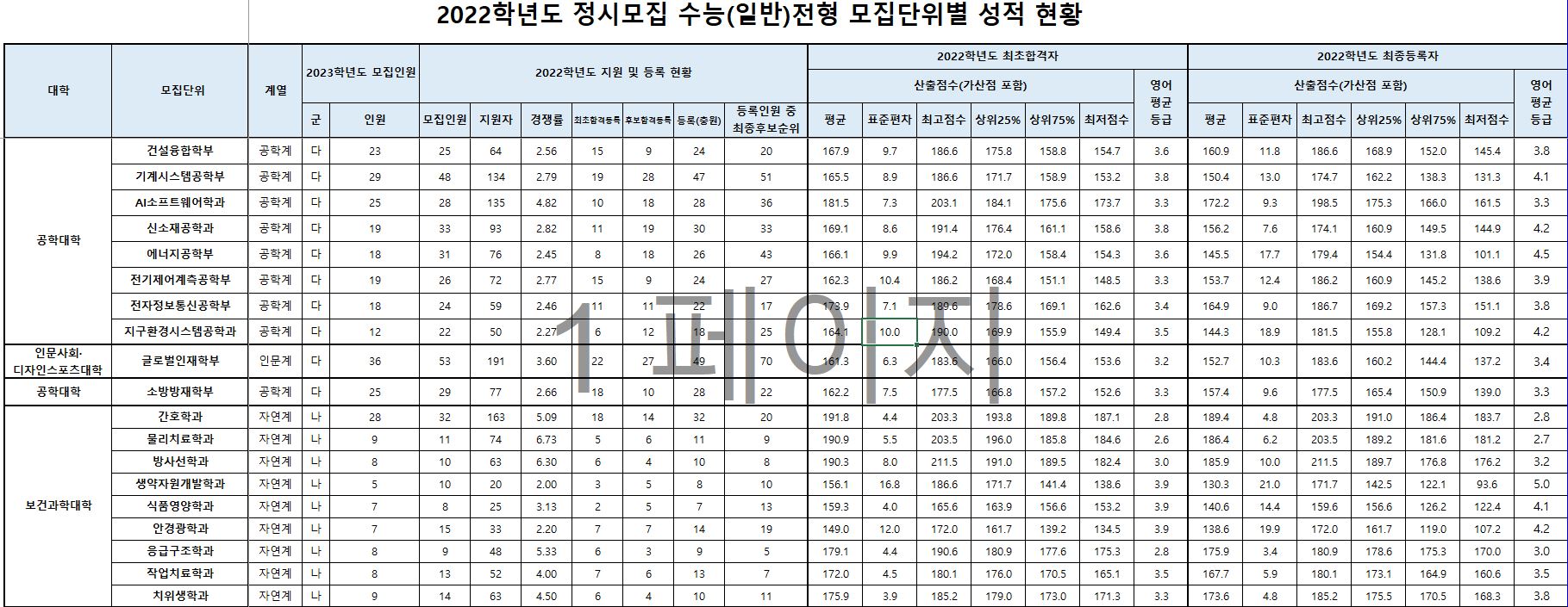 건설융합학부(2.56, 160.9), 기계시스템공학부(2.79, 150.4), AI소프트웨어학과(4.82, 172.2), 신소재공학과(2.82, 156.2), 에너지공학부(2.45, 145.5), 전기제어계측공학부(2.77, 153.7), 전자정보통신공학부(2.46, 164.9), 지구환경시스템공학과(2.27, 144.3), 글로벌인재학부(3.60, 152.7), 소방방재학부(2.66, 157.4), 간호학과(5.09, 189.4), 물리치료학과(6.73, 186.4), 방사선학과(6.30, 185.9), 생약자원개발학과(2.00, 130.3), 식품영양학과(3.13, 140.6), 안경광학과(2.20, 138.6), 응급구조학과(5.33, 175.9), 작업치료학과(4.00, 167.7), 치위생학과(4.50, 173.6), 사회복지학과(3.64, 150.5), 유아교육과(4.14, 163.6), 일본어학과(3.60, 153.0), 자유전공학부(인문계열)(2.82, 142.8), 자유전공학부(자연계열)(2.00, 144.7)