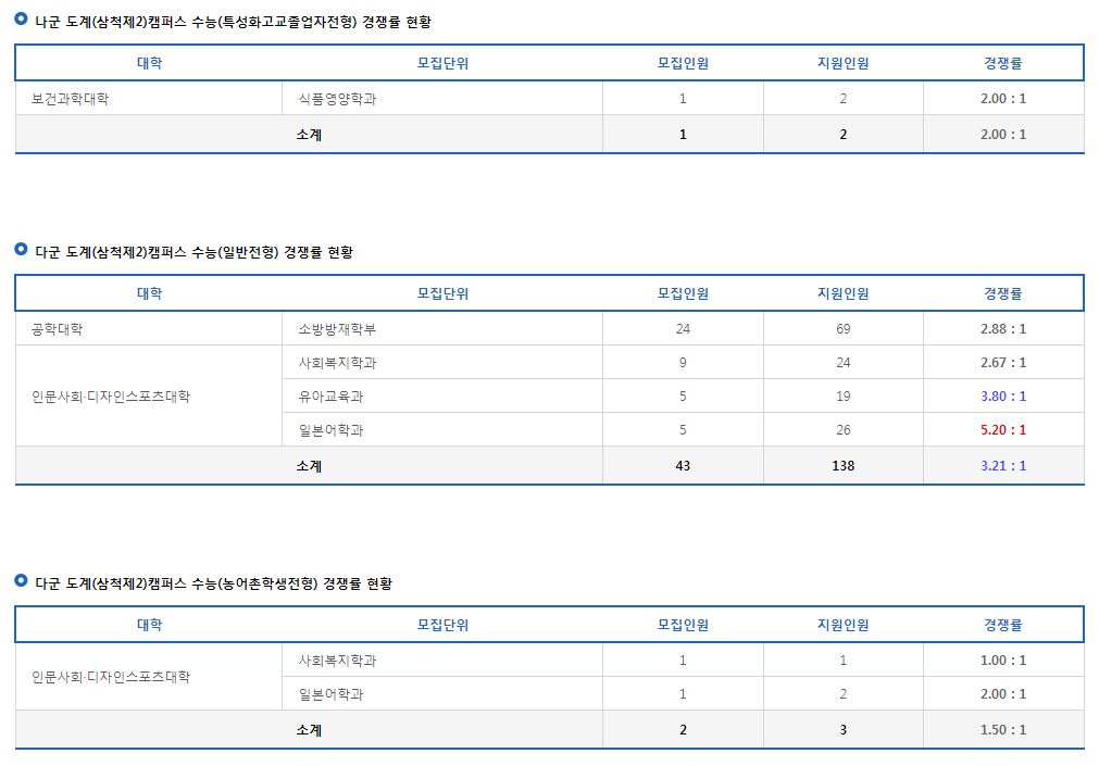 나군 삼척캠퍼스 수능(특성화고교졸업자전형)으로는 생활조형디자인학과를 모집했으며, 경쟁률은 3.00:1 이었습니다.