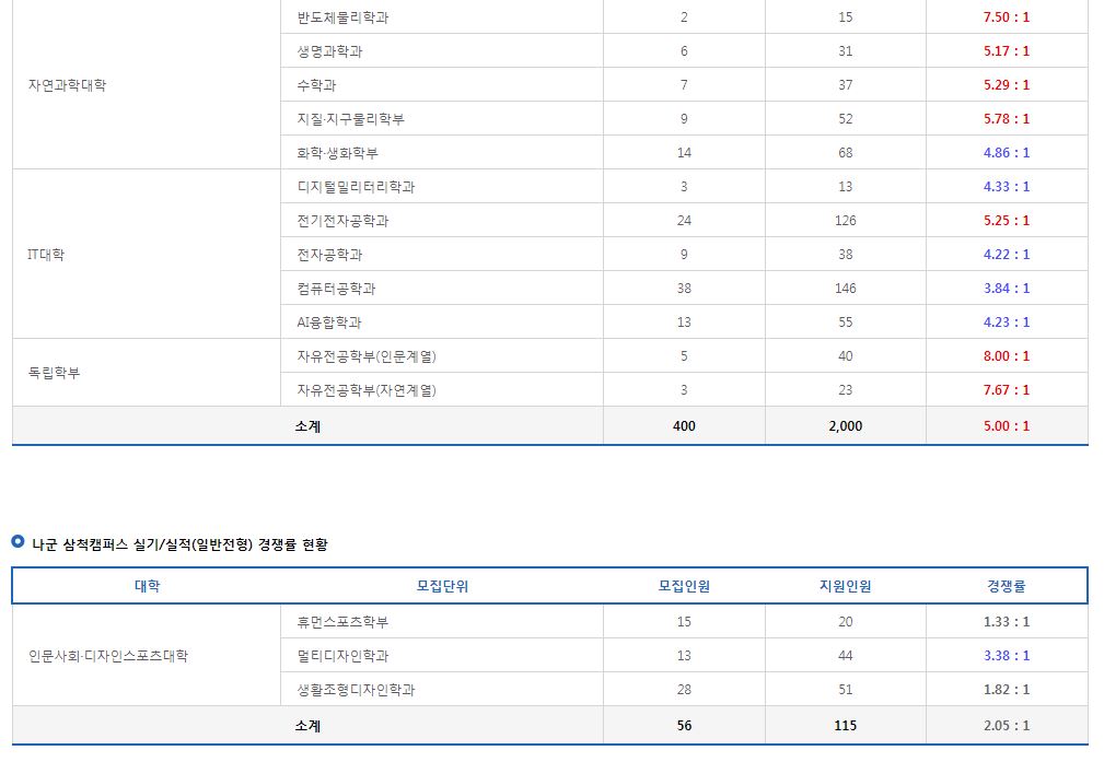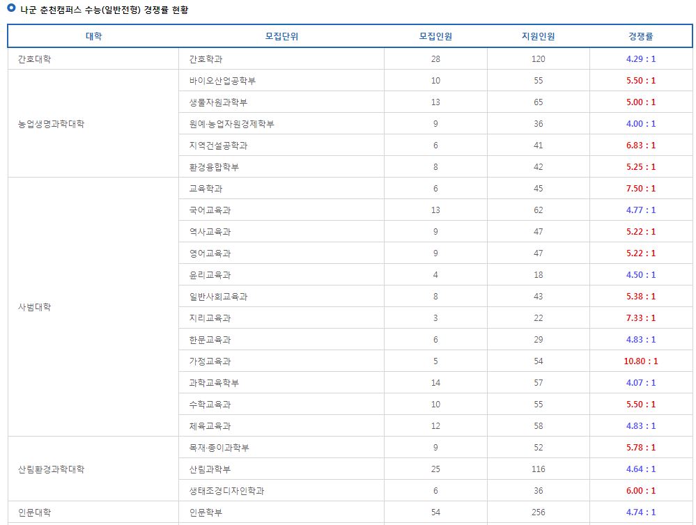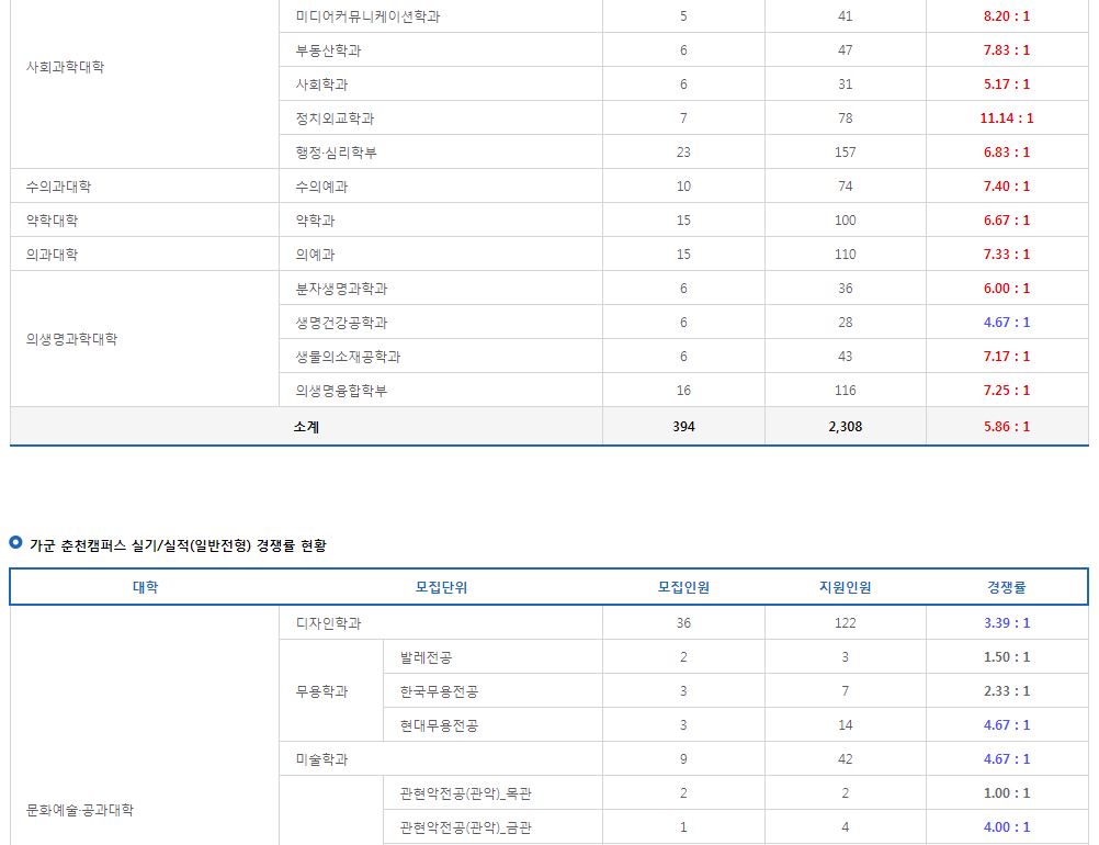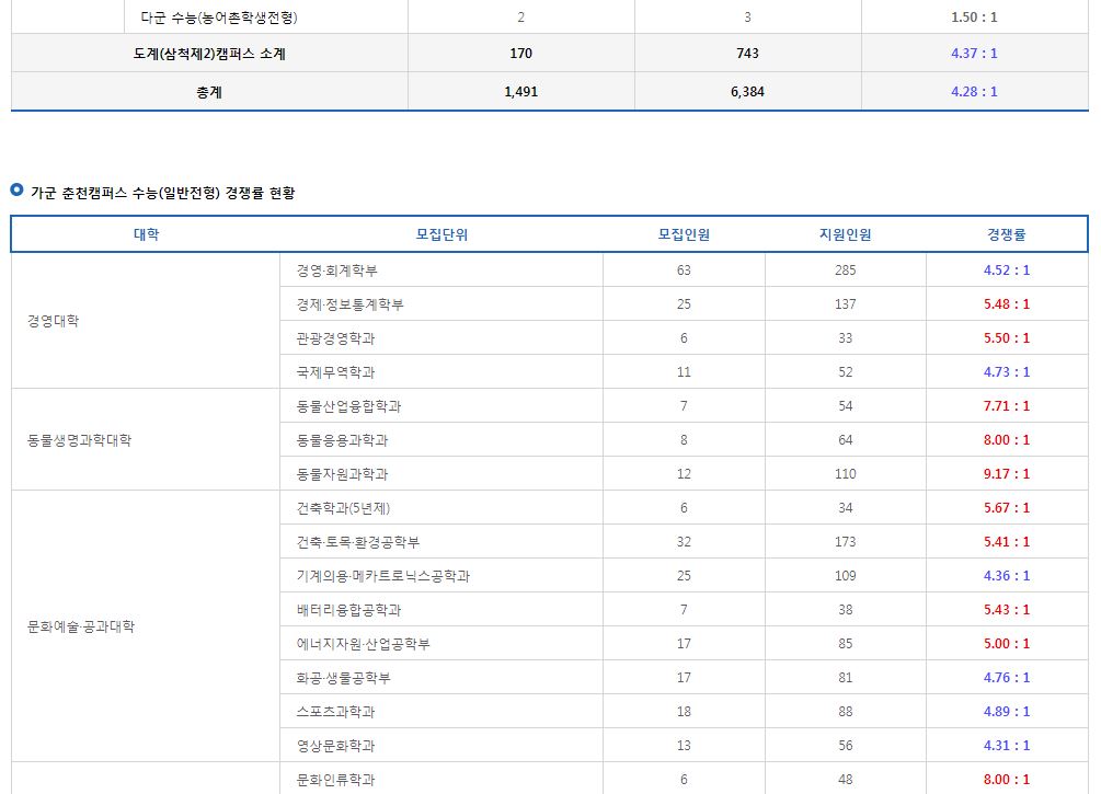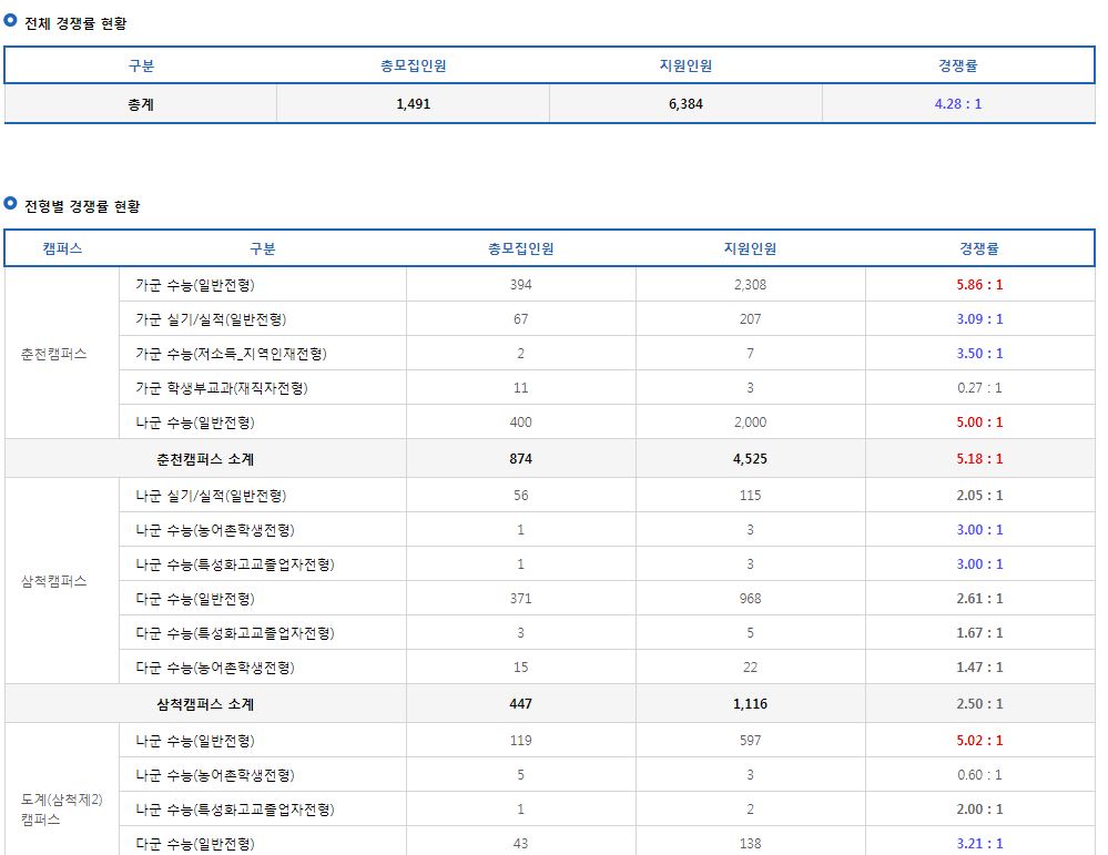 전형별로 보자면 춘천캠퍼스의 가군 학생부교과(재직자전형), 도계(삼척제2)캠퍼스의 나군 수능(농어촌학생전형)은 미달이었으며, 이외의 전형 중 가장 경쟁률이 높았던 전형은 춘천캠퍼스의 가군 수능(일반전형)이었습니다.