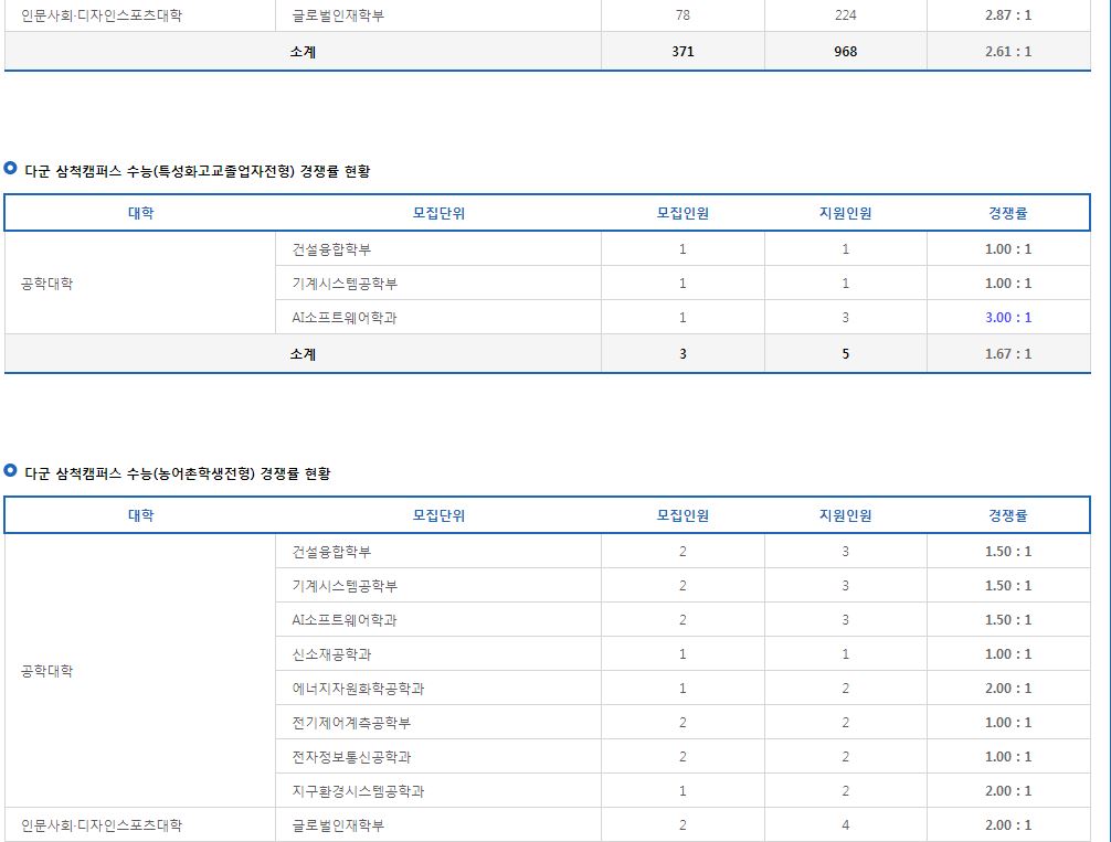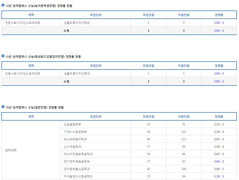 다군 삼척캠퍼스 수능(농어촌학생전형)의 경우 신소재공학과, 전기제어계측공학부, 전자정보통신공학과는 모집인원과 지원인원이 일치했으며, 에너지자원화학공학과, 지구환경시스템공학과, 글로벌인재학부의 경쟁률이 2.00:1로 가장 높았습니다.