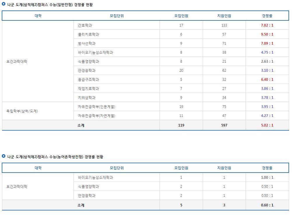 나군 도계(삼척제2)캠퍼스 수능(농어촌학생전형)에서는 식품영양학과, 안경광학과가 미달이었으며 바이오기능성소재학과는 모집인원과 지원인원이 같았습니다.