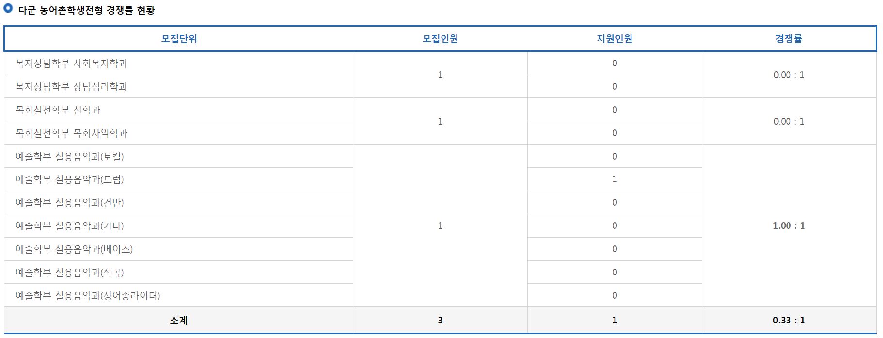 다군 농어촌학생전형은 예술학부를 제외하고 모두 미달이었으며, 예술학부는 모집인원과 지원인원이 같았으며, 지원자의 구체적인 전공은 실용음악과(드럼) 이었습니다.