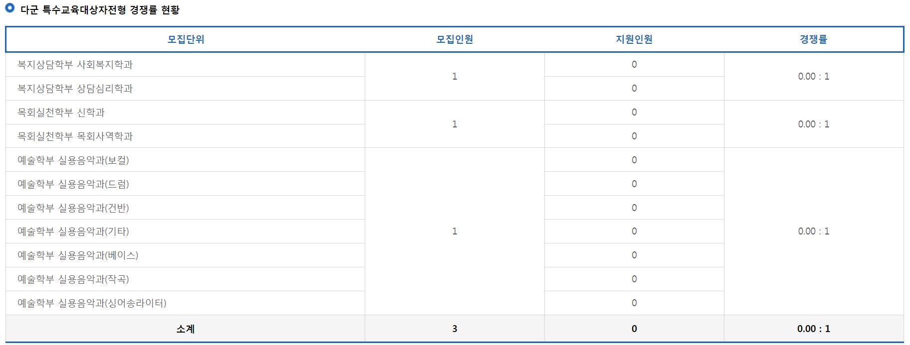 다군 특수교육대상자전형에서도 복지상담학부, 목회실천학부, 예술학부의 신입생을 모집했으며, 모두 미달이었습니다.