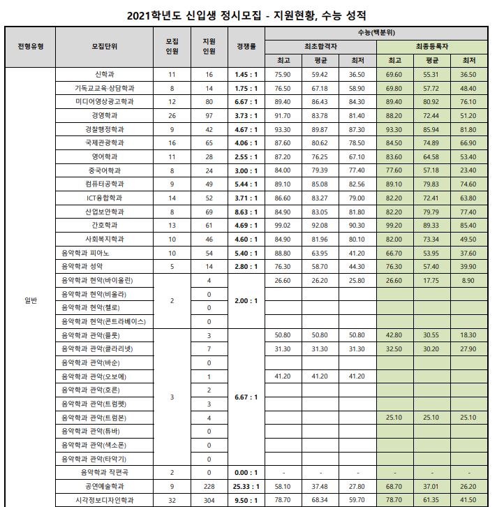 한세대학교는 모든 학과를 가군에서 모집하고 있기 때문에 정시 모집 군이 아닌 경쟁률에 초점을 두고 자료를 보도록 하겠습니다.