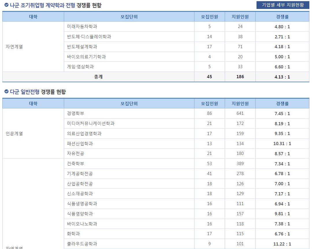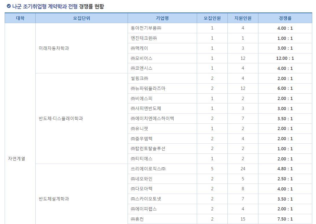 나군 조기취업형 계약학과에 대해 조금 더 자세히 보자면, 처음부터 기업을 선택해서 지원하게 되는데요, 미래자동차학과에서 가장 경쟁률이 높았던 학과는 (주)모비어스(12.00:1) 였으며, 반도체디스플레이학과에서는 (주)뉴파워플라즈마(6.00:1)의 경쟁률이 가장 높았습니다. 탑런토탈솔루션은 모집인원과 지원인원이 같았습니다.