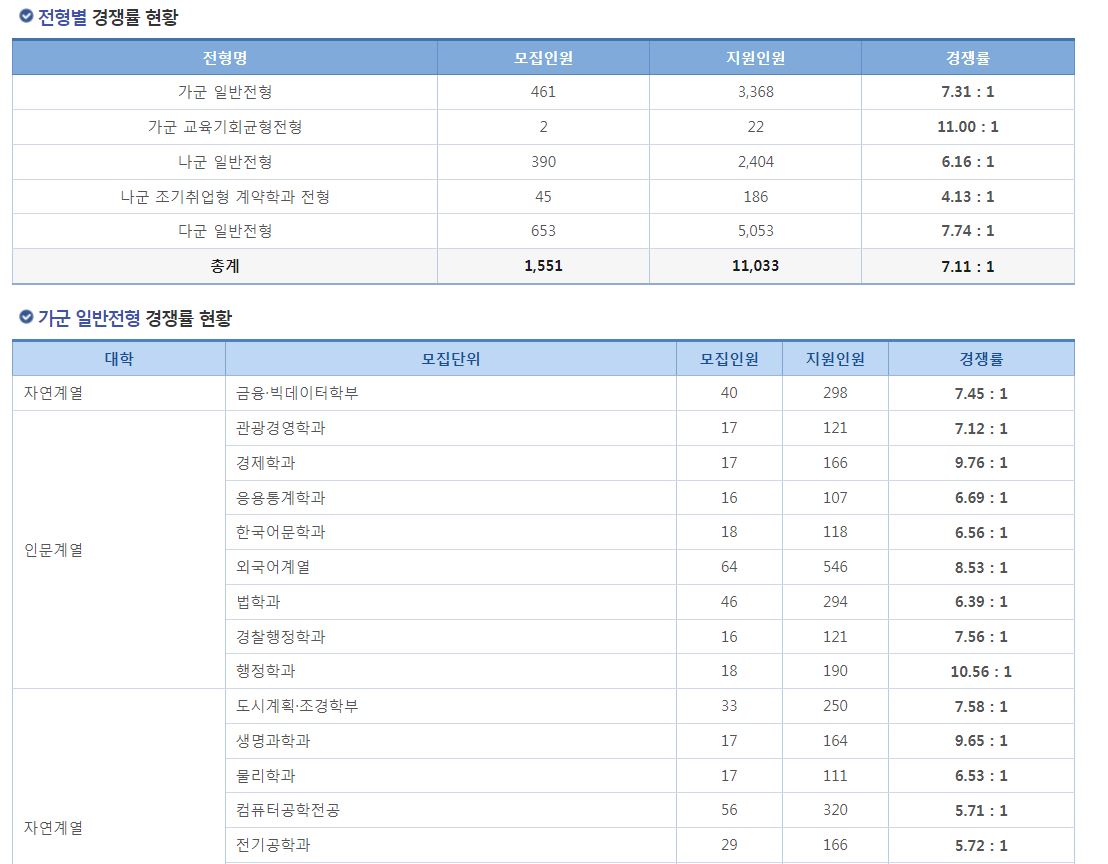 가군 : 금융빅데이터학부, 관광경영학과, 경제학과, 응용통계학과, 한국어문학과, 외국어계열, 법학과, 경찰행정학과, 행정학과, 도시계획조경학부, 생명과학과, 물리학과, 컴퓨터공학전공, 전기공학과, 의예과, 한의예과, 약학과, 연기예술학과(연출전공)