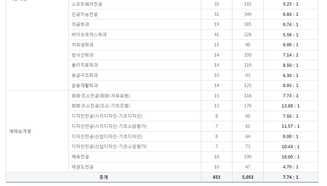 다군 일반전형에서 가장 경쟁률이 높았던 학과는 체육전공(19.00:1), 회화조소전공(조소-기초조형)(13.08:1), 클라우드공학과(11.22:1) 순이었습니다.