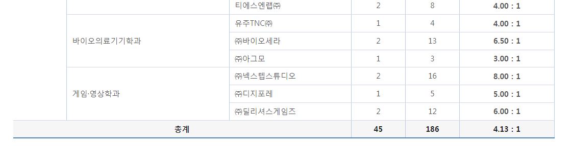 반도체설계학과의 경쟁률이 가장 높았던 학과는 (주)휴컨(7.50:1)이었으며, 바이오의료기기학과에서는 (주)바이오세라(6.50:1), 게임영상학과에서는 (주)넥스텝스튜디오(8.00:1)의 경쟁률이 가장 높았습니다.