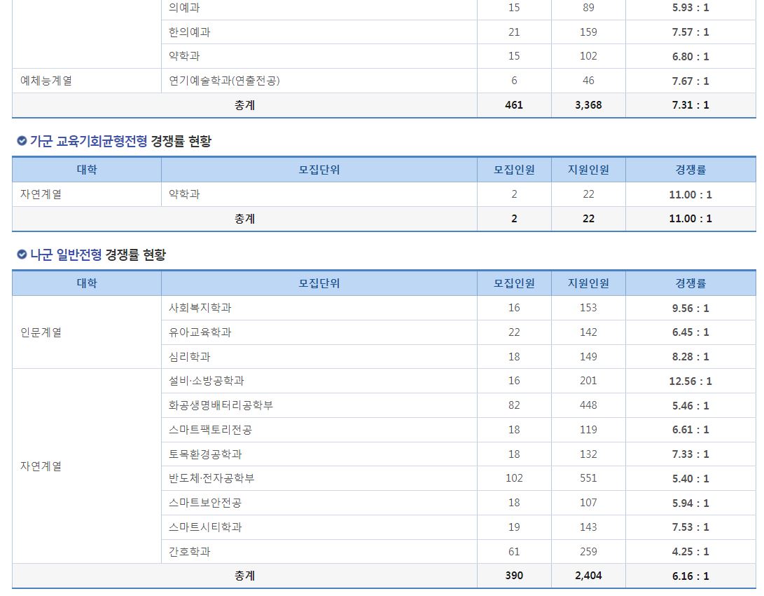 전형별로 보자면, 가군 교육기회전형(11.00:1)의 경쟁률이 가장 높았습니다.
