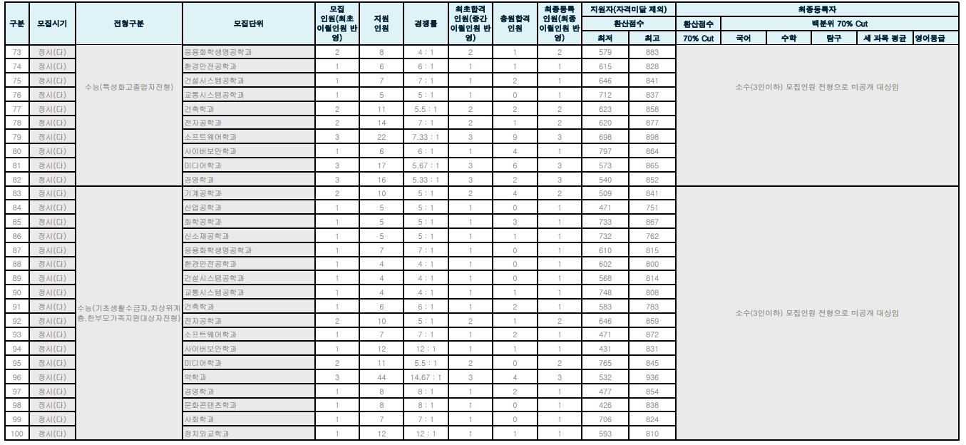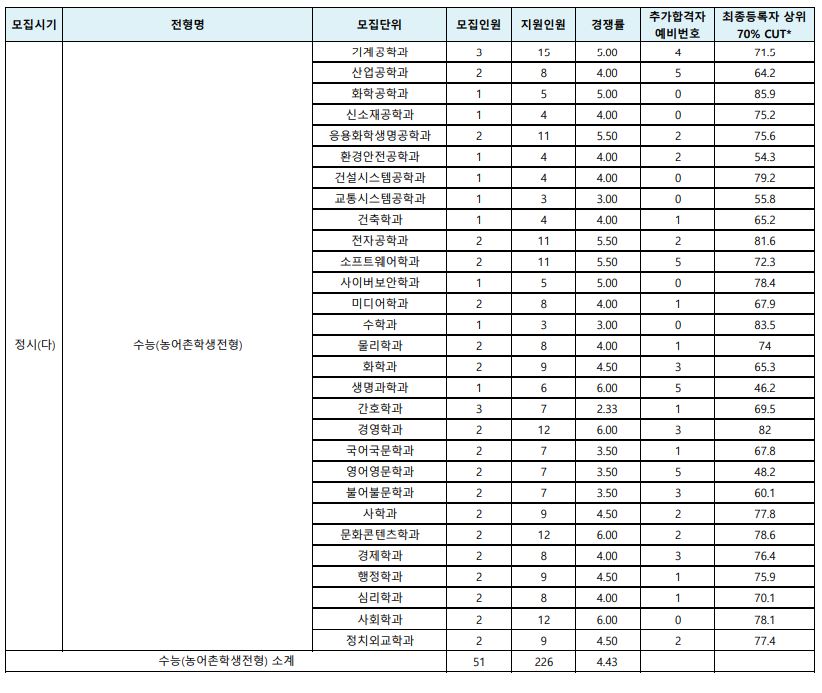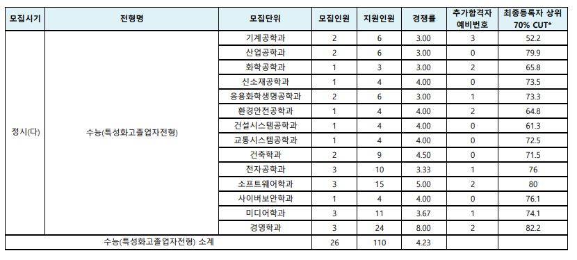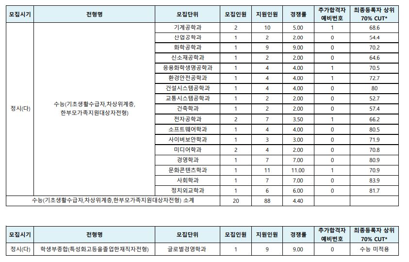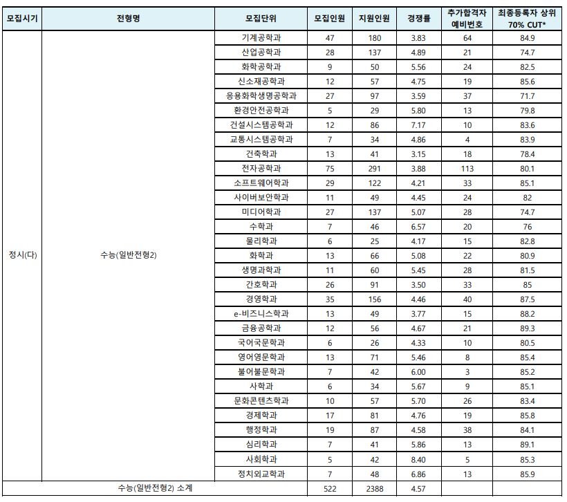다군 : 기계공학과, 산업공학과, 화학공학과, 첨단신소재공학과, 응용화학생명공학과, 환경안전공학과, 건설시스템공학과, 교통시스템공학과, 건축학과, AI모빌리티공학과, 전자공학과, 지능형반도체공학과, 소프트웨어학과, 사이버보안학과, 미디어학과, 수학과, 물리학과, 화학과, 생명과학과, 간호학과, 경영학과, e-비즈니스학과, 금융공학과, 국어국문학과, 영어영문학과, 불어불문학과, 사학과, 문화콘텐츠학과, 경제학과, 행정학과, 심리학과, 사회학과, 정치외교학과, 약학과, 간호학과