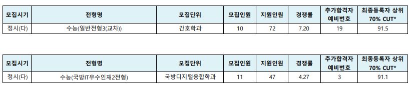 다군 : 기계공학과, 산업공학과, 화학공학과, 신소재공학과, 응용화학생명공학과, 환경안전공학과, 건설시스템공학과, 교통시스템공학과, 건축학과, 전자공학과, 지능형반도체공학과, 소프트웨어학과, 사이버보안학과, 미디어학과, 수학과, 물리학과, 화학과, 생명과학과, 간호학과, 경영학과, e-비즈니스학과, 금융공학과, 국어국문학과, 영어영문학과, 불어불문학과, 사학과, 문화콘텐츠학과, 경제학과, 행정학과, 심리학과, 사회학과, 정치외교학과, 간호학과, 국방디지털융합학과