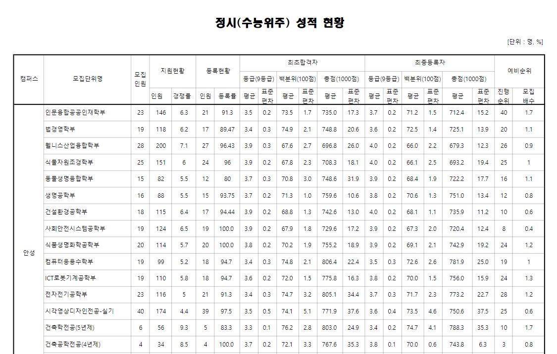 한경국립대학교에서는 이전 정시 모집 군을 공개하고 있지 않기 때문에 경쟁률을 중심으로만 자료를 살펴보도록 하겠습니다.