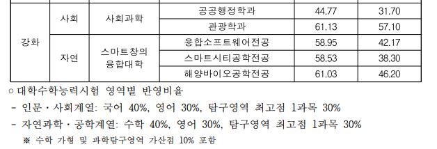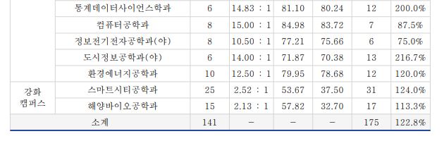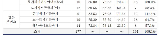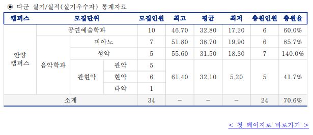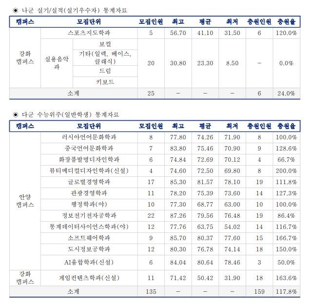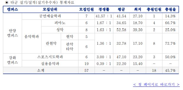이 중 실용음악과는 미달이었으며, 이외의 학과 중 가장 경쟁률이 높았던 학과는 공연예술학과(41.57:1), 행정학과(야)(18.80:1), 행정학과(15.83:1) 순이었습니다.
