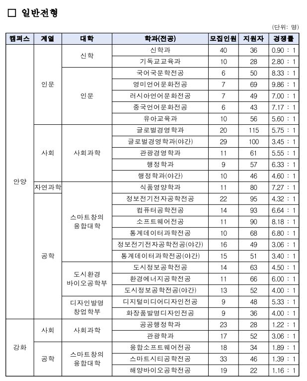 2021학년도 안양대학교의 정시 모집 군은 공개하고 있지 않기 때문에 경쟁률 위주로 보도록 하겠습니다.