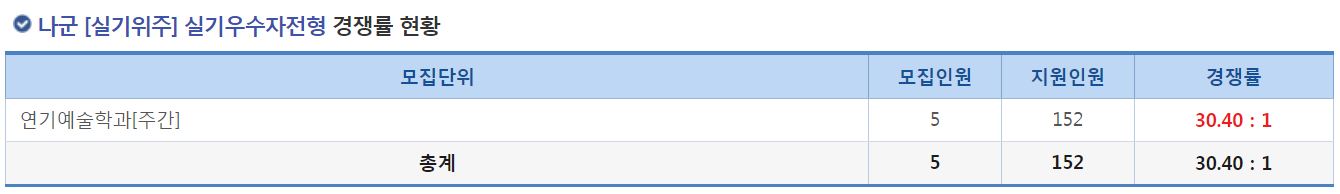 나군 [실기위주] 실기우수자전형에서는 연기에술학과[주간]의 신입생을 모집했으며, 경쟁률은 30.40:1 이었습니다.