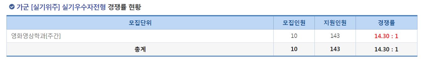 가군 [실기위주] 실기우수자전형에서는 영화영상학과[주간]의 신입생을 모집했으며, 경쟁률은 14.30:1 이었습니다.