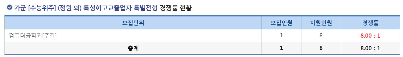 가군 [수능위주] (정원 외) 특성화고교졸업자 특별전형에서는 컴퓨터공학과[주간]의 신입생을 모집했으며, 경쟁률은 8.00:1 이었습니다.
