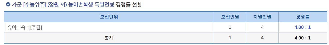 가군 [수능위주] (정원 외) 농어촌학생 특별전형에서는 유아교육과[주간]의 신입생을 모집했으며, 경쟁률은 4.00:1 이었습니다.