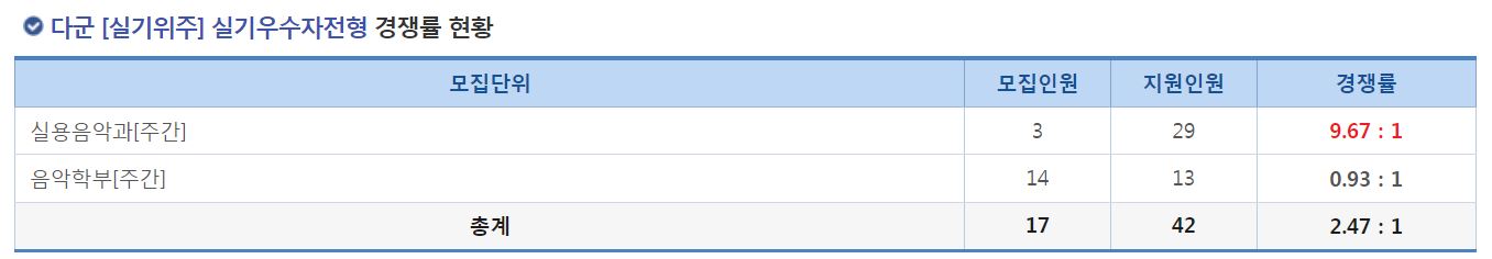 다군 [실기위주] 실기우수자전형에서는 실용음악과[주간], 음악학부[주간]의 신입생을 모집했으며, 음악학부[주간]은 미달이었으며, 실용음악과[주간]의 경쟁률은 9.67:1 이었습니다.