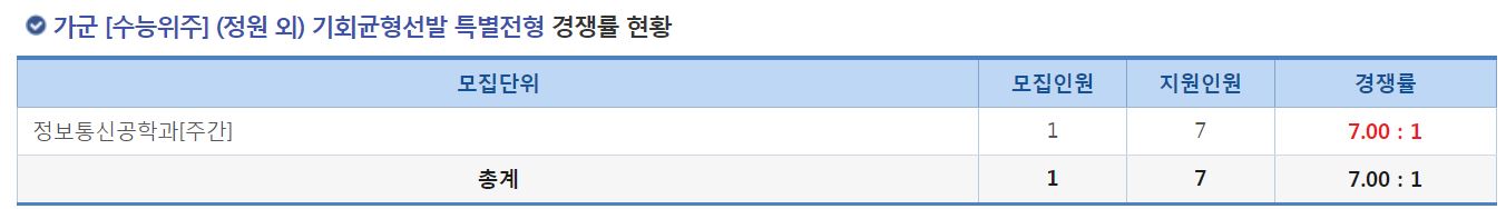 가군 [수능위주] (정원 외) 기회균형선발 특별전형에서는 정보통신공학과[주간]의 신입생을 모집했으며, 경쟁률은 7.00:1 이었습니다.
