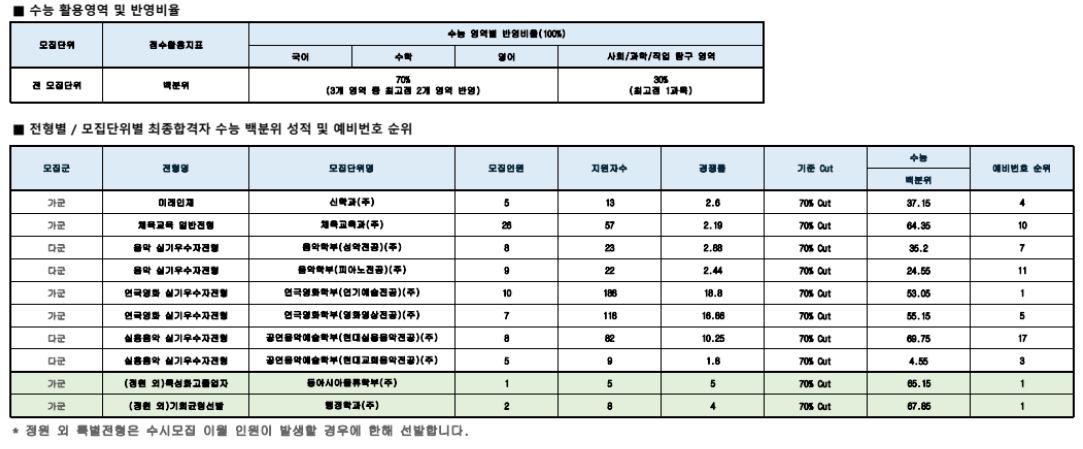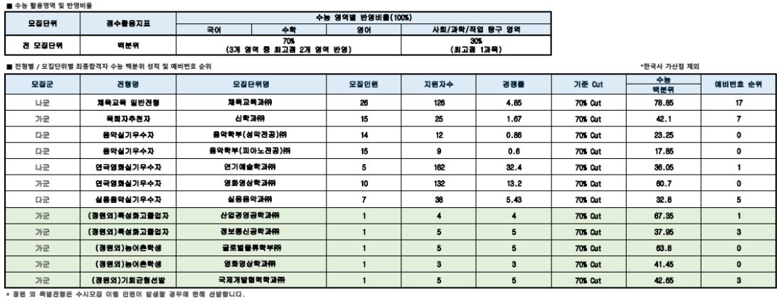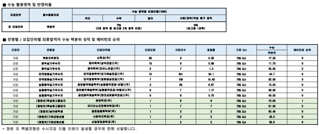 다군 : 음악학부(성악전공)(주), 음악학부(피아노전공)(주), 실용음악과(주), 공연음악예술학부(실용음악전공-보컬)(주), 공연음악예술학부(실용음악전공-보컬외)(주), 공연음악예술학부(현대교회음악전공)(주)