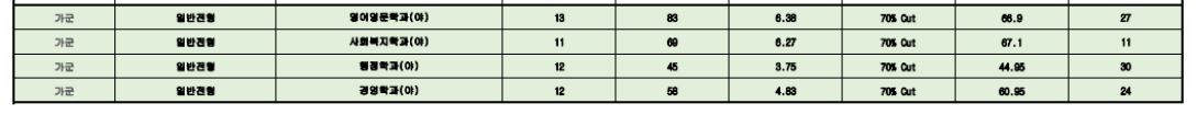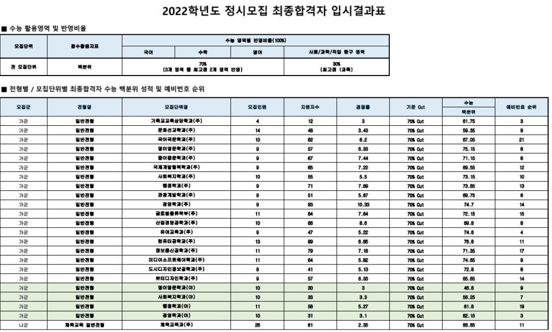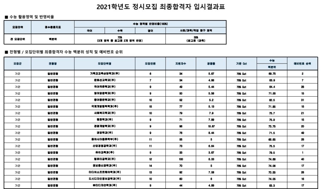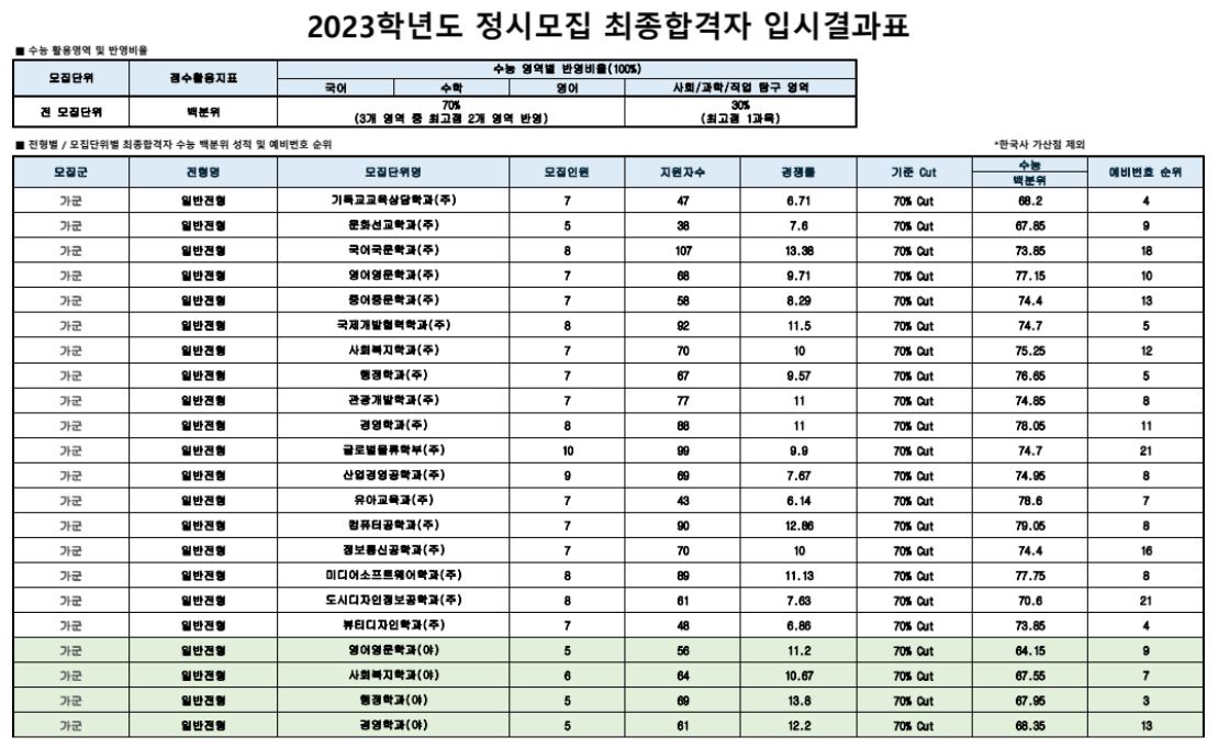 가군 : 기독교교육상담학과(주), 문화선교학과(주), 국어국문학과(주), 영어영문학과(주), 중어중문학과(주), 국제개발협력학과(주), 사회복지학과(주), 행정학과(주), 관광개발학과(주), 경영학과(주), 동아시아물류학부(주), 산업경영공학과(주), 유아교육과(주), 컴퓨터공학과(주), 정보통신공학과(주), 미디어소프트웨어학과(주), 도시디자인정보공학과(주), 뷰티디자인학과(주), 영어영문학과(야), 사회복지학과(야), 행정학과(야), 경영학과(야), 신학과(주), 체육교육과(주), 동아시아물류학부(주)(정원외), 행정학과(주)(정원외)