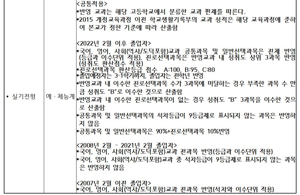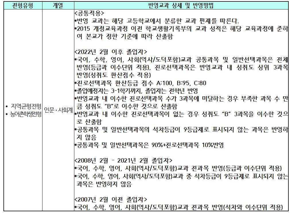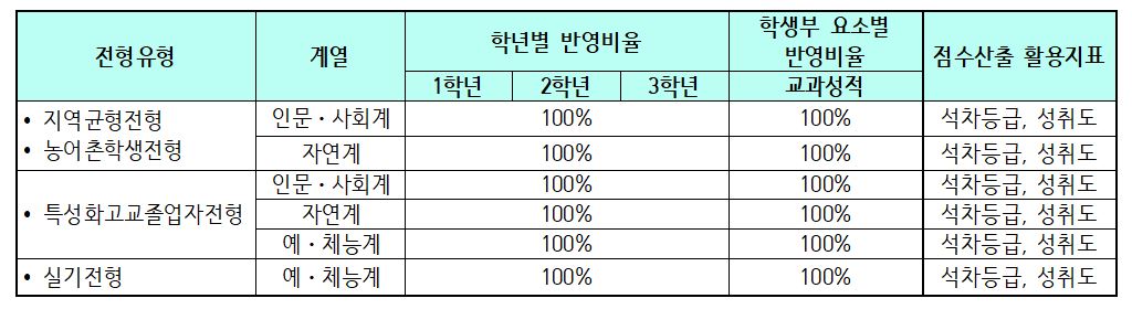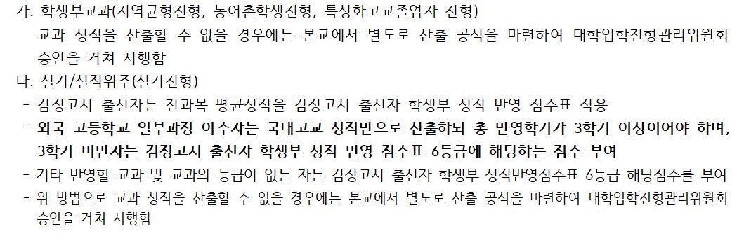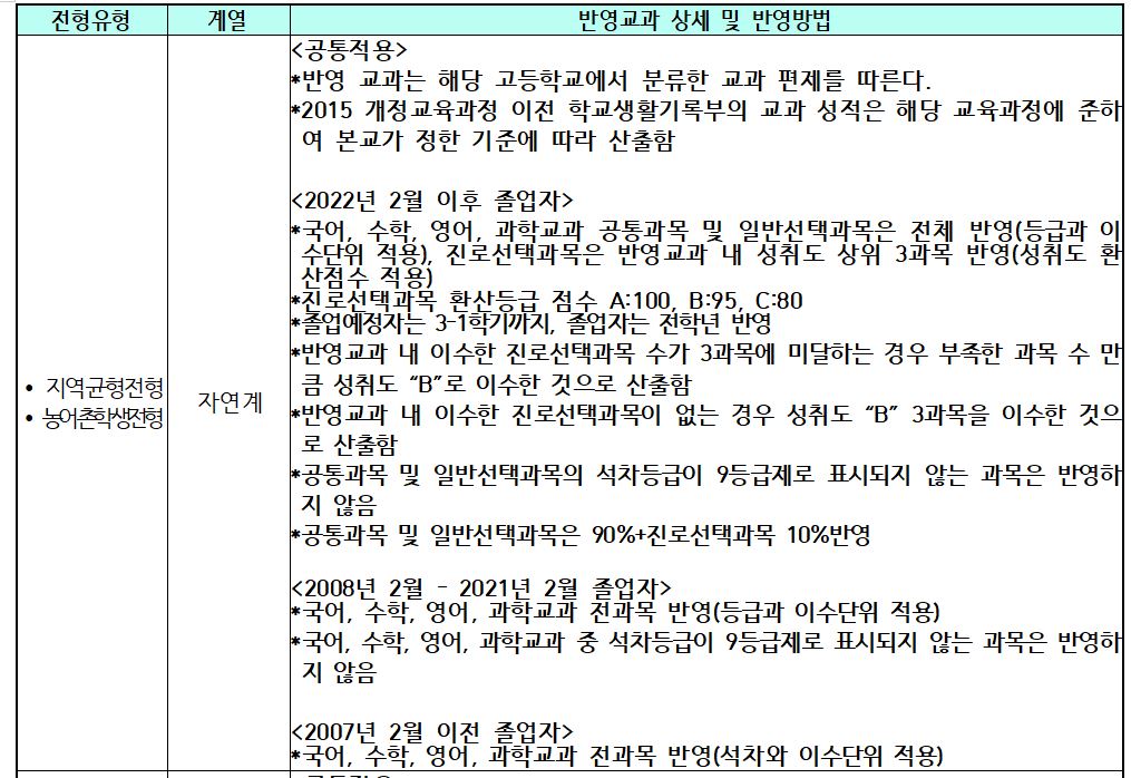3. 학생부교과(지역균형전형, 농어촌학생전형, 특성화고교졸업자전형, 실기전형) 학생부 교과성적 반영 방법