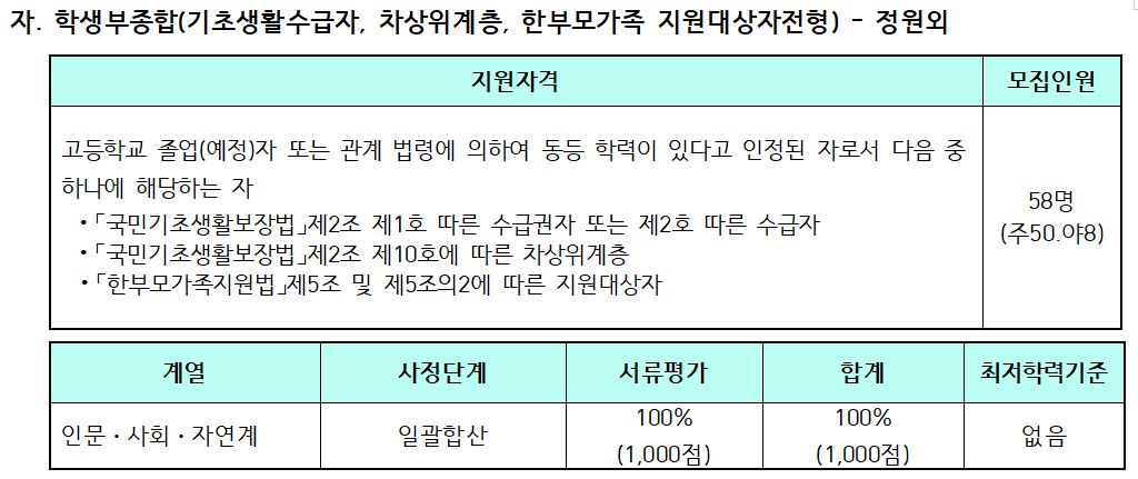 학생부종합(기초생활수급자, 차상위계층, 한부모가족 지원대상자전형) - 정원외에서는 58명을 모집할 예정이며, 주간 50명, 야간 8명을 모집할 예정입니다. 서류평가 100%로 학생을 모집할 예정입니다.