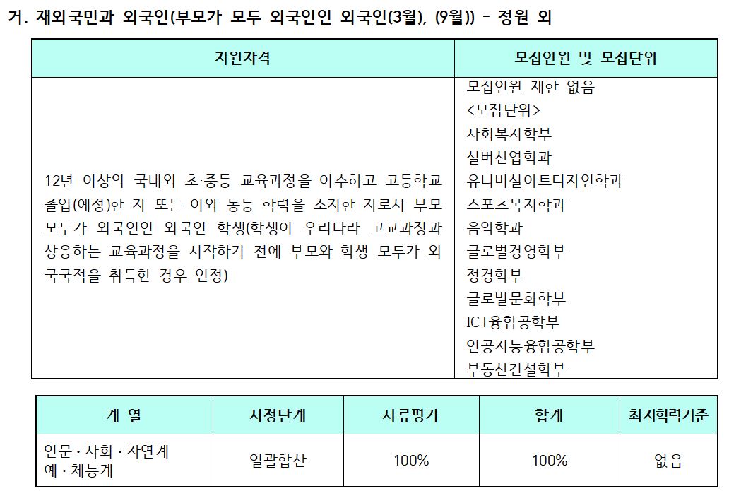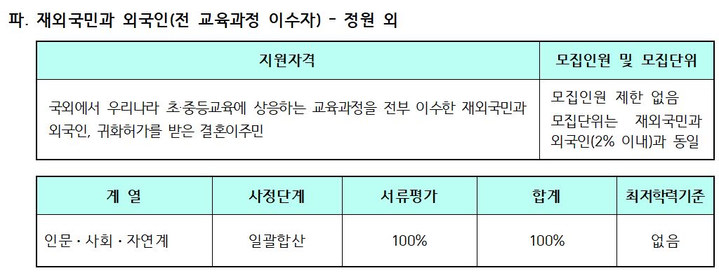 재외국민과 외국인(전 교육과정 이수자) -정원외에서는 모집인원 제한 없이 학생을 모집할 예정이며, 서류평가 100%로 학생을 모집합니다.
